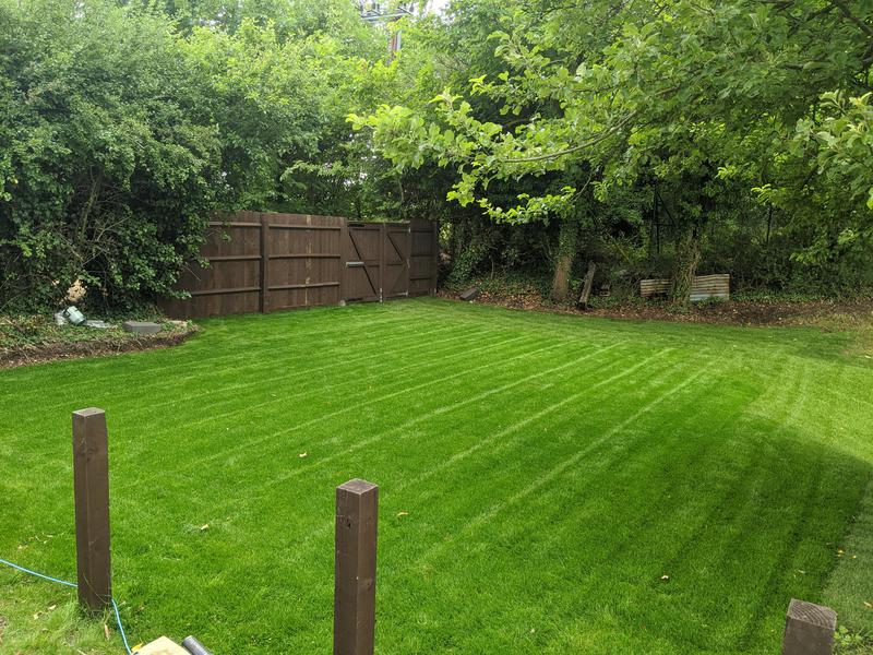 - New turf and closeboard fence stained Forrest brown
