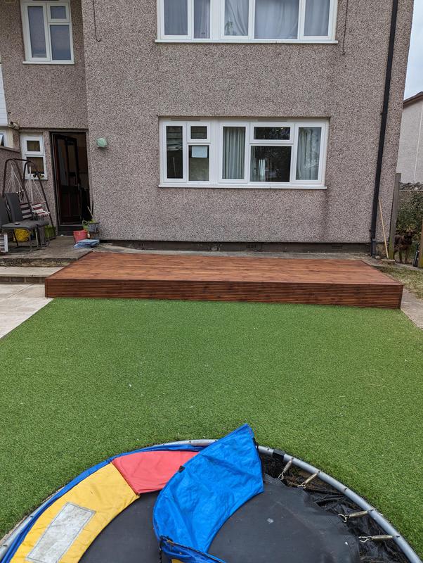 - New decking stained dark teak and artificial grass