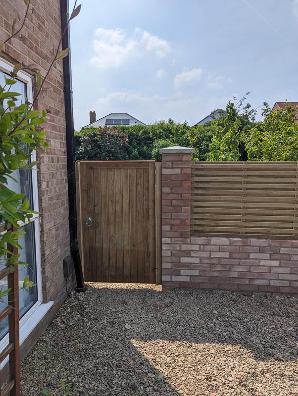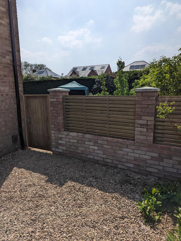 - Dwarf wall with pillars and hit and miss fence panels and a new gate
