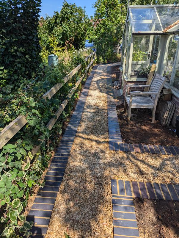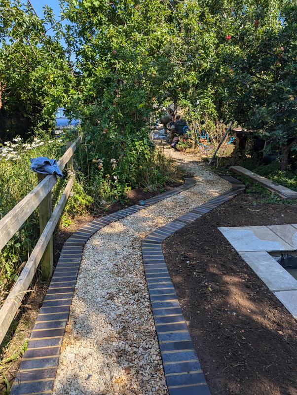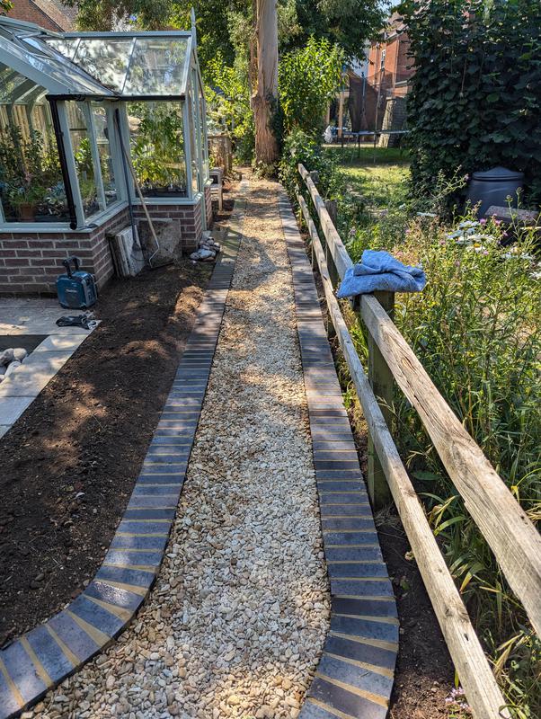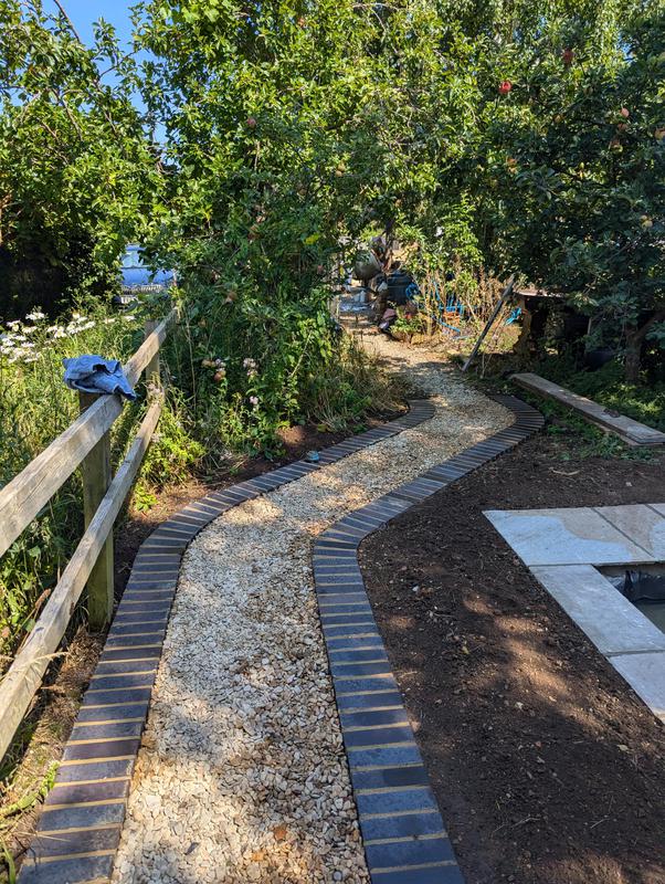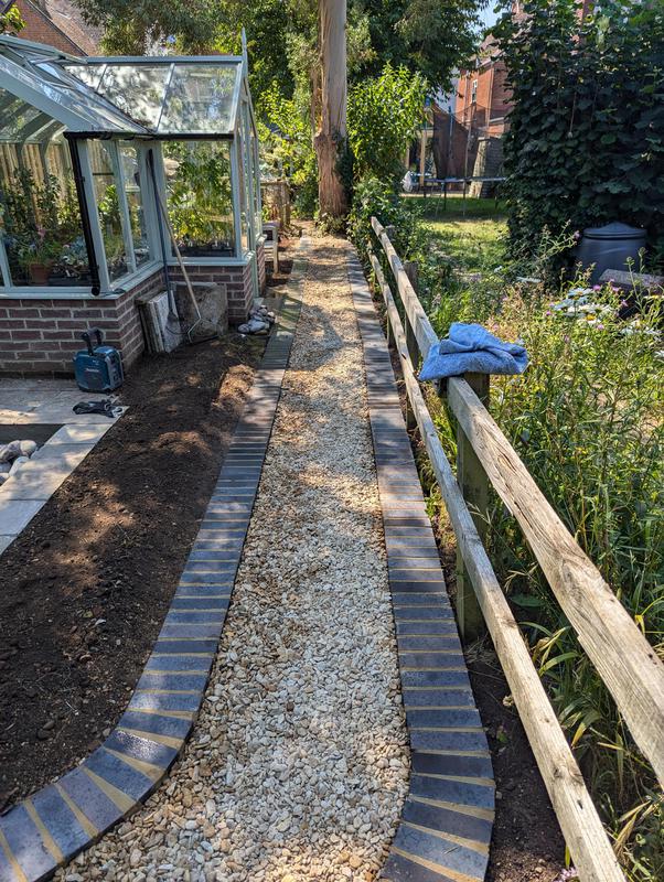 - Pathway made of blue engineering bricks and 20mm shingle