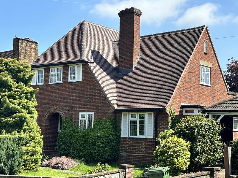 - A new roof using a Redland concrete plain tile with third round hips in Tudor Brown.