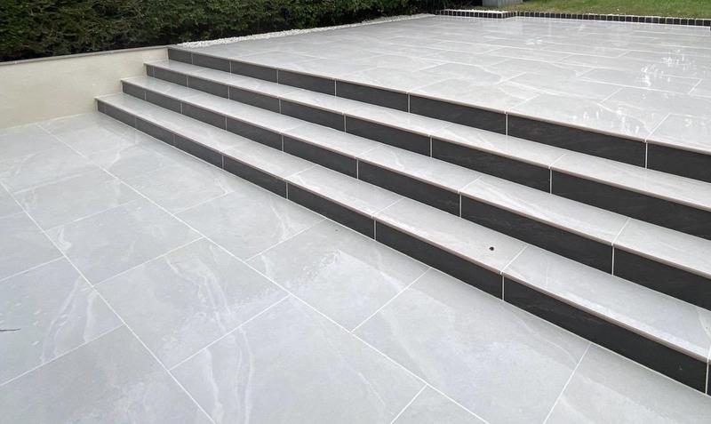 - Kiara Pearl Porcelain slabs, Patio and steps.