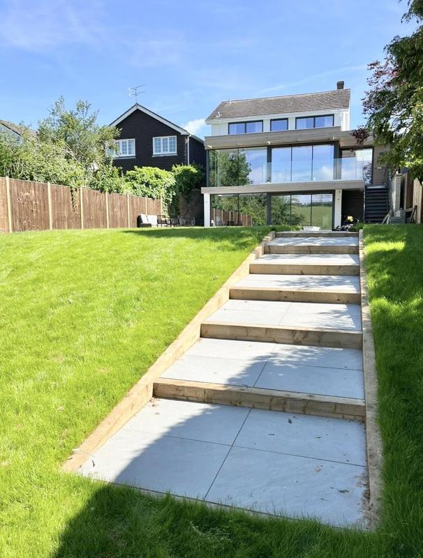 - Terraced Patio in Bradstone Textured Paving , Sleeper Step Feature in Luton