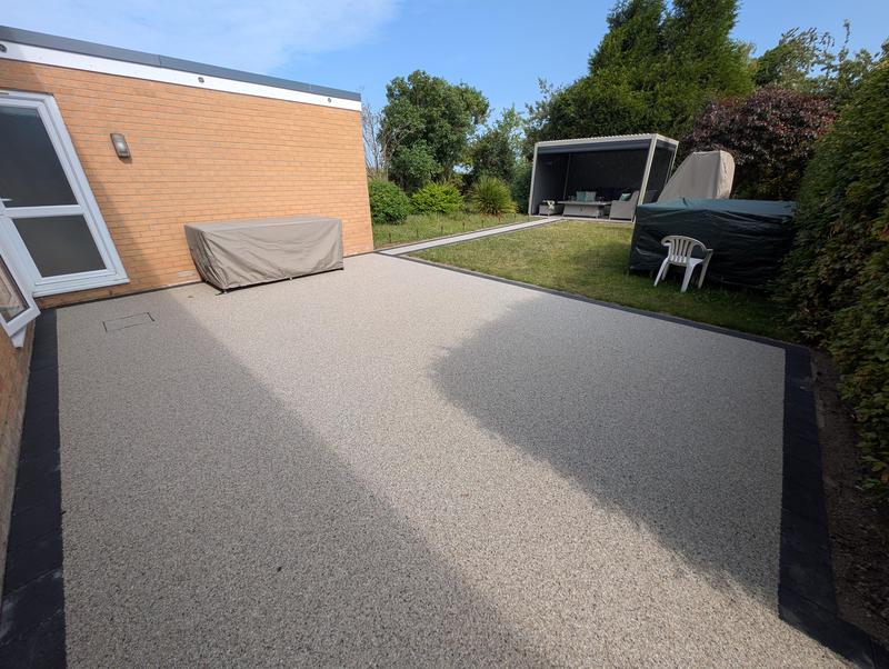 Richard - Image 1 "Resin bound patio area and pergola base. From day one it was clear that Andrew and his team take pride in their work. They were all very polite and friendly, arrived on time every day, worked extremely hard and tidied up before leaving each day. Any possible issues were discussed with us to ensure we got the result we wanted and Andrew was also able to accommodate a couple of late changes to the work, adding the path and resin overlay of a covered passage. Unfortunately the weather delayed the laying of the resin as it cannot be laid if there is a risk of rain, but Andrew and his team returned on the very first suitable dry day to complete the job. We are thrilled with the finished result and now we have erected the pergola it looks fantastic. It will give us the impetus to complete the other changes we have planned to give us a beautiful garden. I would be happy to recommend AMS to anyone and if we need any similar work doing in the future, AMS will be the first people we call."