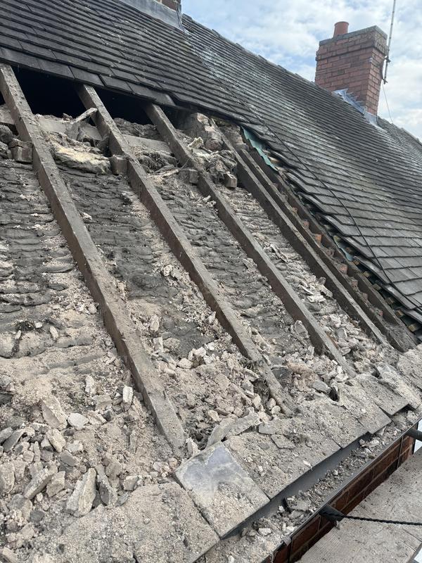 - Roof being stripped ready for new roof.