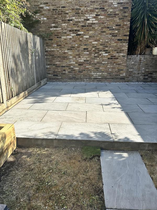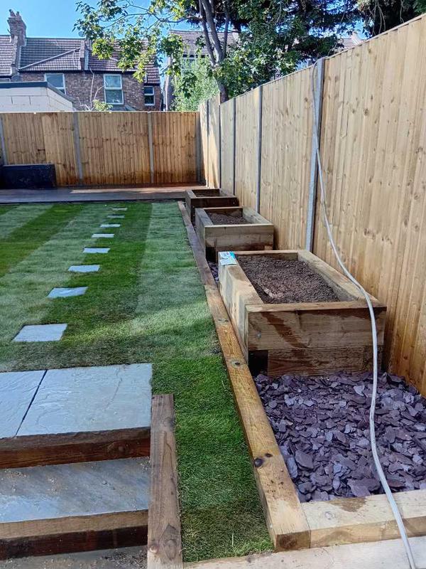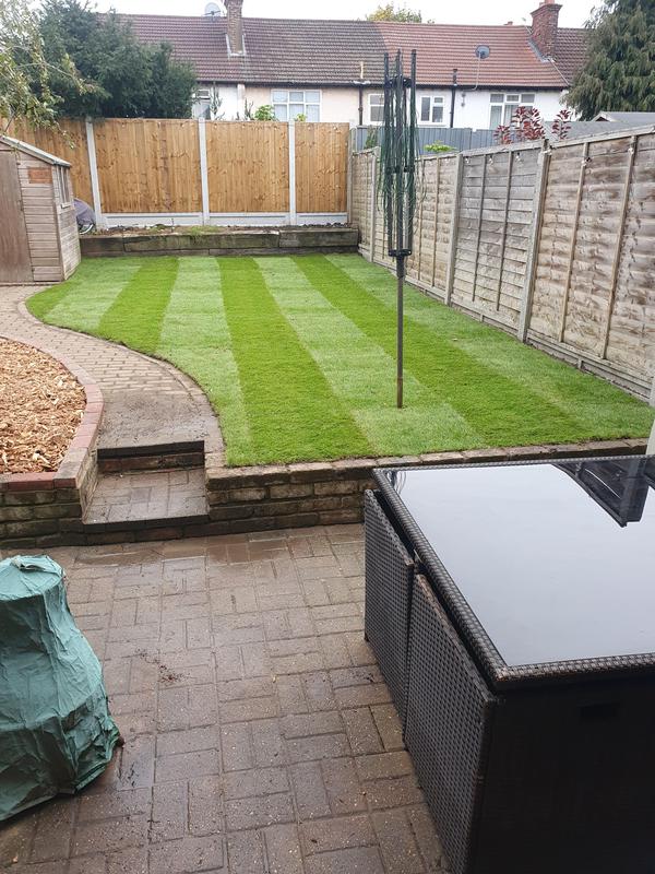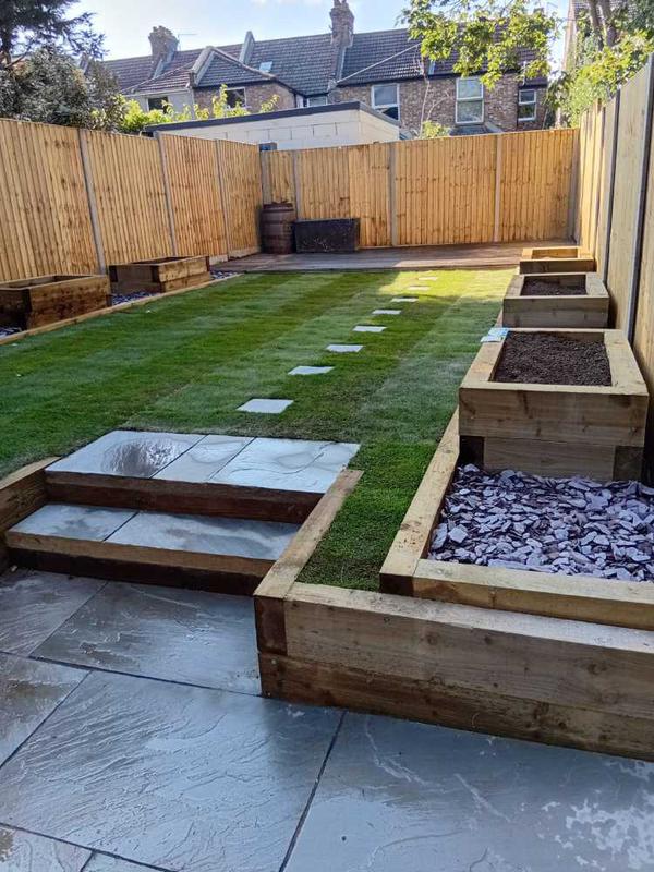 - Complete new garden. Walls built & rendered with lighting installed to make raised boarders. Bench built. New horizontal fence erected. White stone laid. Paving laid for patio & artificial lawn laid.