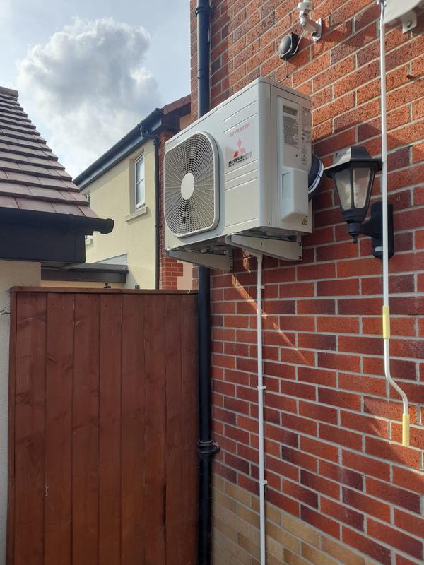 - Mitsubishi condensers mounted to the rear of a house where pipes were buried underground