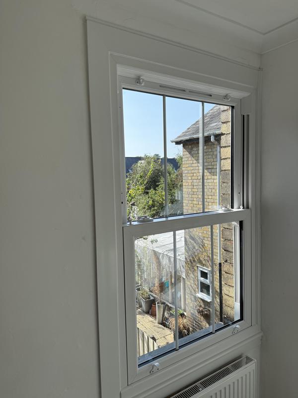 - White wood grain UPVC sash window with mock sash horn caps, to keep the appearance of the original windows as much as possible!