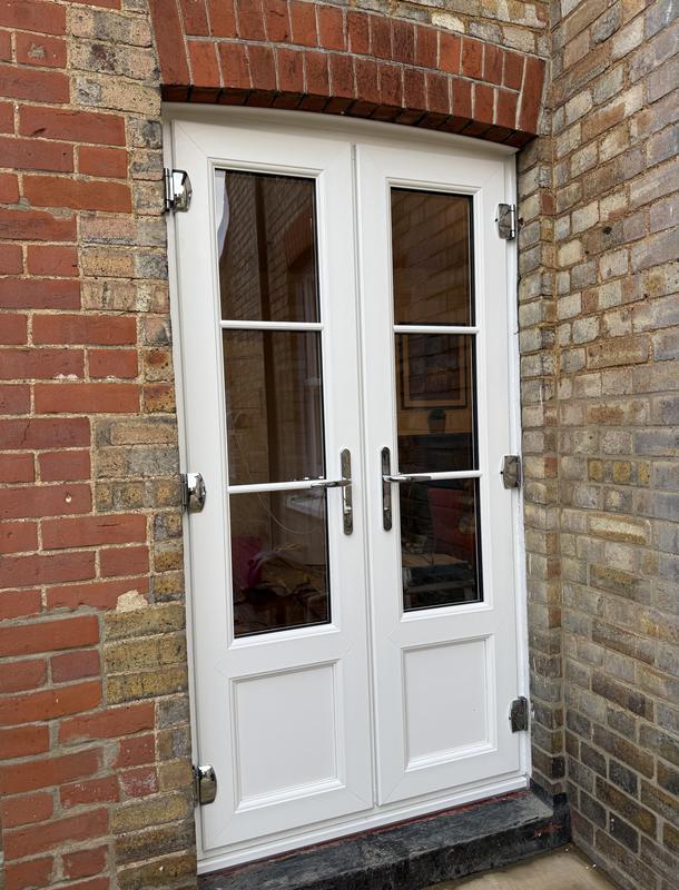- White wood grain French doors with astrgal bars trying to keep with appearance of the original timber doors in Bishops Stortford