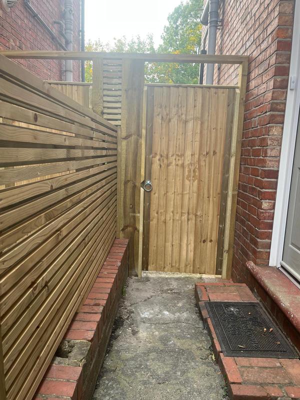 - Featherboard gate and matching infill supplied by Jacksons Fencing. Comes with a 25 year guarantee.
