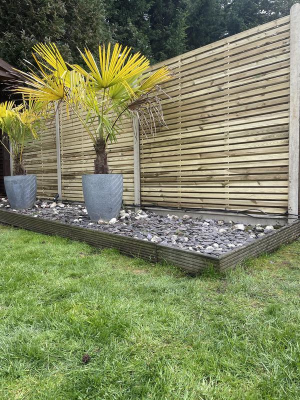- 1.5m high Jacksons Fencing featherboard panels with 300mm square trellis on top. Comes with 25 year guarantee.