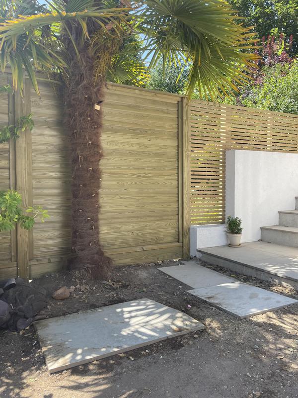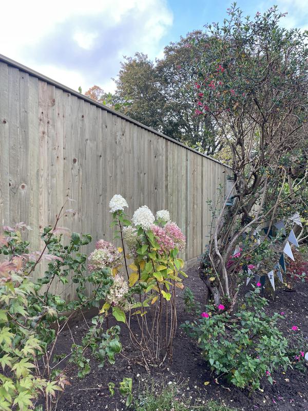 - Close board fencing installed down hill with the gradient of the garden to maintain the 1.8m fence height down the garden.
