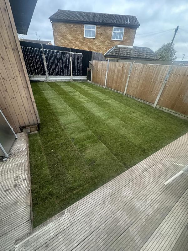 - Kandala Grey Indian Sandstone with new turf and grey block edging and featheredge fencing