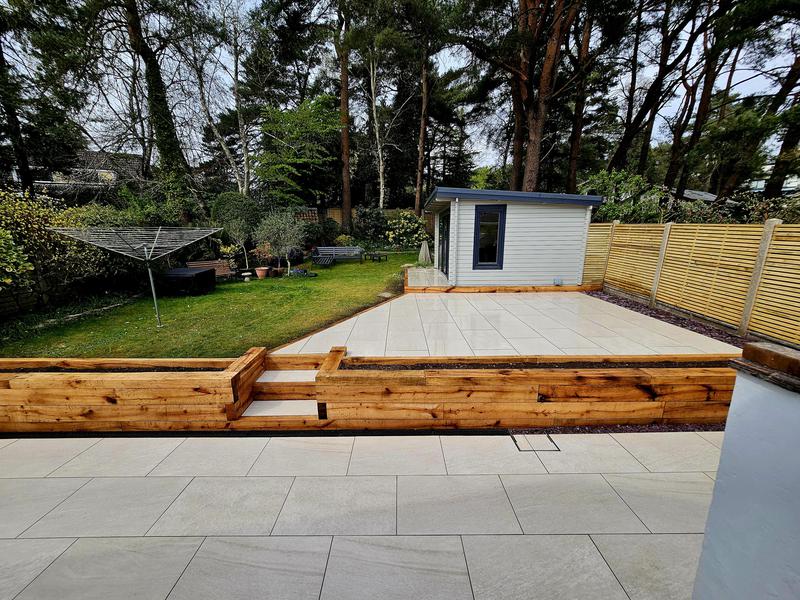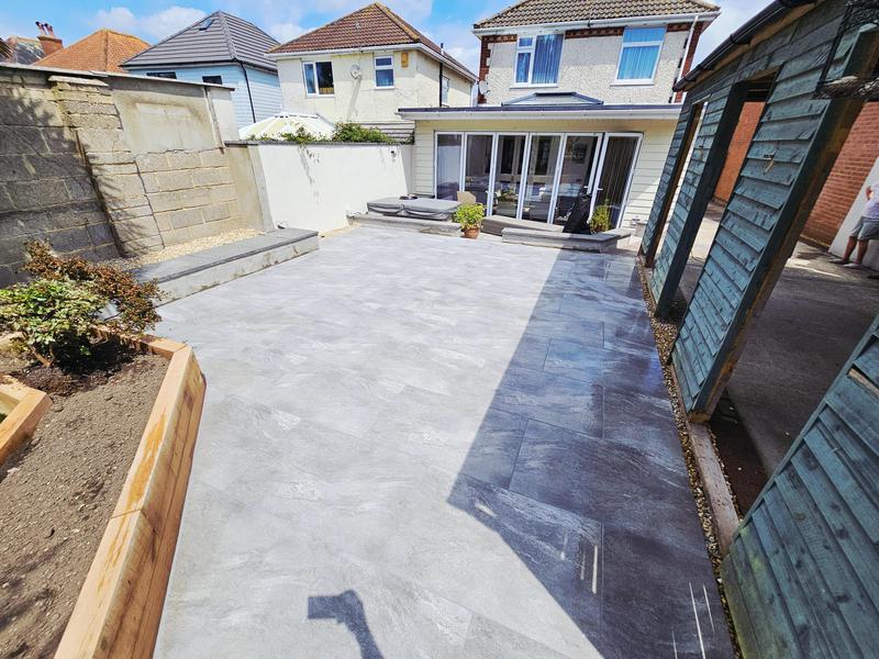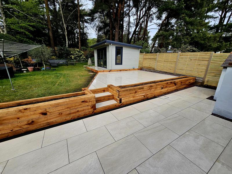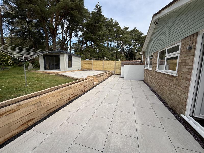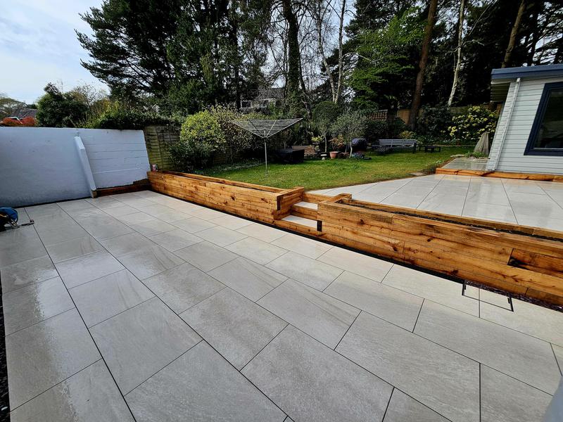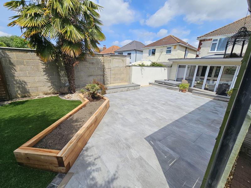 Chris - Image 1 "Darren and Bradley made a great job of our garden transformation, from a tired old loose concrete patio and crumbling stone retaining wall to multiple levels of crisp porcelain patios and oak sleeper wall and borders. We had a rough idea what we wanted but when Darren came round to quote he offered great suggestions and ideas we hadn’t thought of. Start date was as advised, on time every day and had a tidy up each day throughout the project. He kept us informed and continued to suggest ideas throughout as we couldn’t be there every day due to work and he also accommodated changes we requested during the project. All rubbish removed, hosed and swept down leaving everything clean and tidy. Invoiced as quoted plus extras we requested. We are very pleased with the result and with D Pope Surfacing and Landscapes and would recommend them to anyone and I’m sure we’ll be back in touch when it comes to front garden and driveway. Thankyou Chris & Julie Broadstone, Poole"