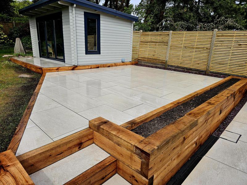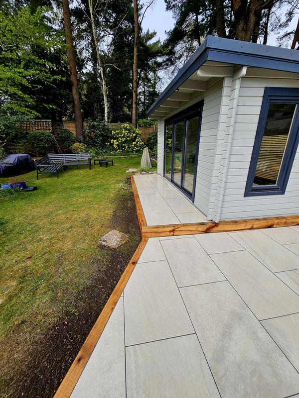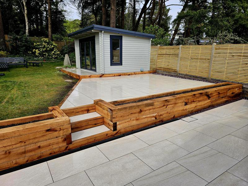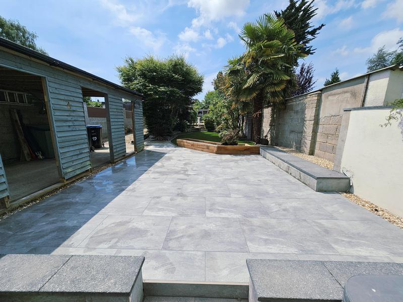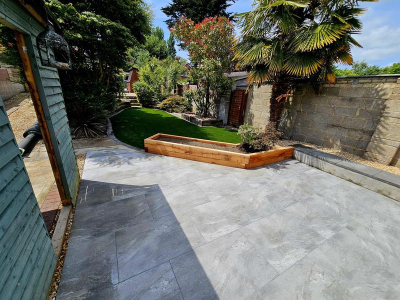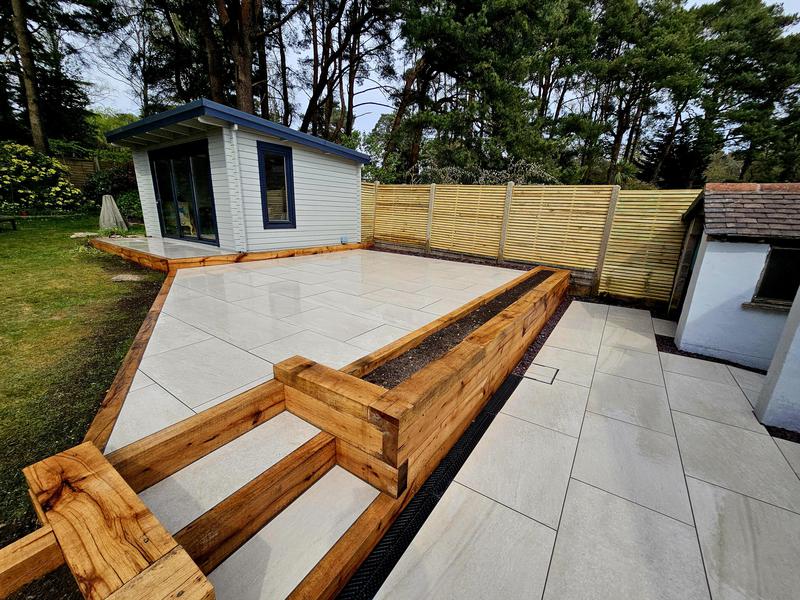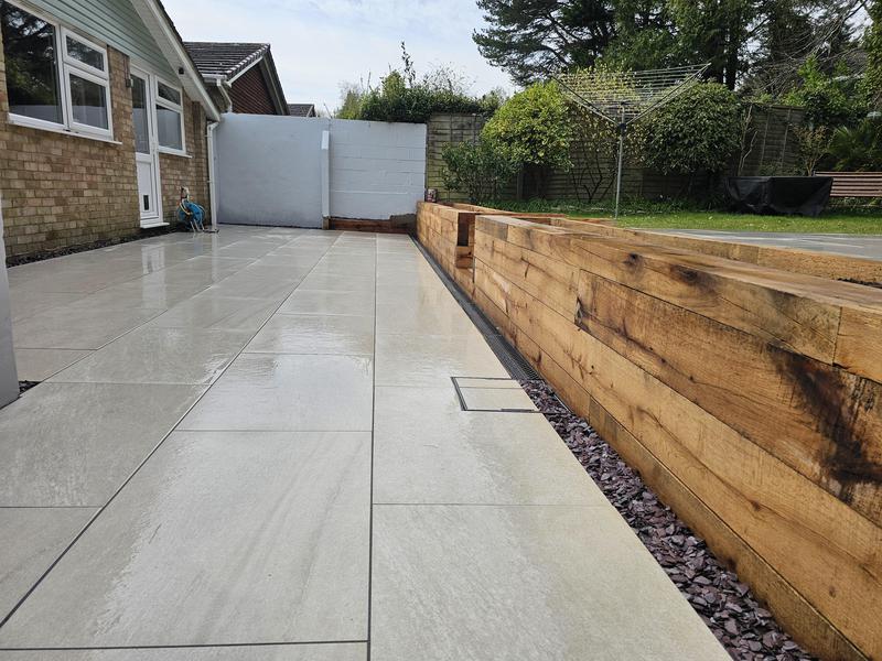 Chris - Image 1 "Darren and Bradley made a great job of our garden transformation, from a tired old loose concrete patio and crumbling stone retaining wall to multiple levels of crisp porcelain patios and oak sleeper wall and borders. We had a rough idea what we wanted but when Darren came round to quote he offered great suggestions and ideas we hadn’t thought of. Start date was as advised, on time every day and had a tidy up each day throughout the project. He kept us informed and continued to suggest ideas throughout as we couldn’t be there every day due to work and he also accommodated changes we requested during the project. All rubbish removed, hosed and swept down leaving everything clean and tidy. Invoiced as quoted plus extras we requested. We are very pleased with the result and with D Pope Surfacing and Landscapes and would recommend them to anyone and I’m sure we’ll be back in touch when it comes to front garden and driveway. Thankyou Chris & Julie Broadstone, Poole"