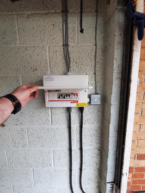 - Consumer unit installation in garage for EV charger and new circuits in garage.