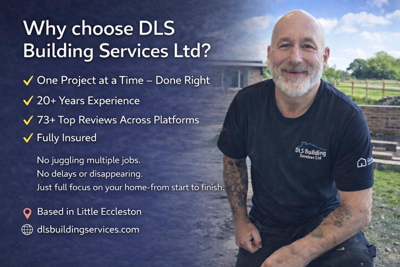 Builders. DLS Building Services Ltd has been vetted and approved by TrustATrader. Covering Little Eccleston Great Eccleston, Staining, Bispham, Broughton, Garstang, Poulton-le-Fylde, Thornton-Cleveleys, Lytham St Annes, Kirkham. As well as surrounding areas of Preston and the Fylde Coast