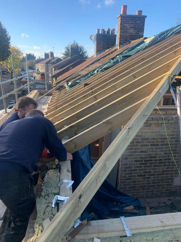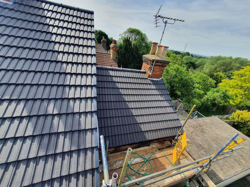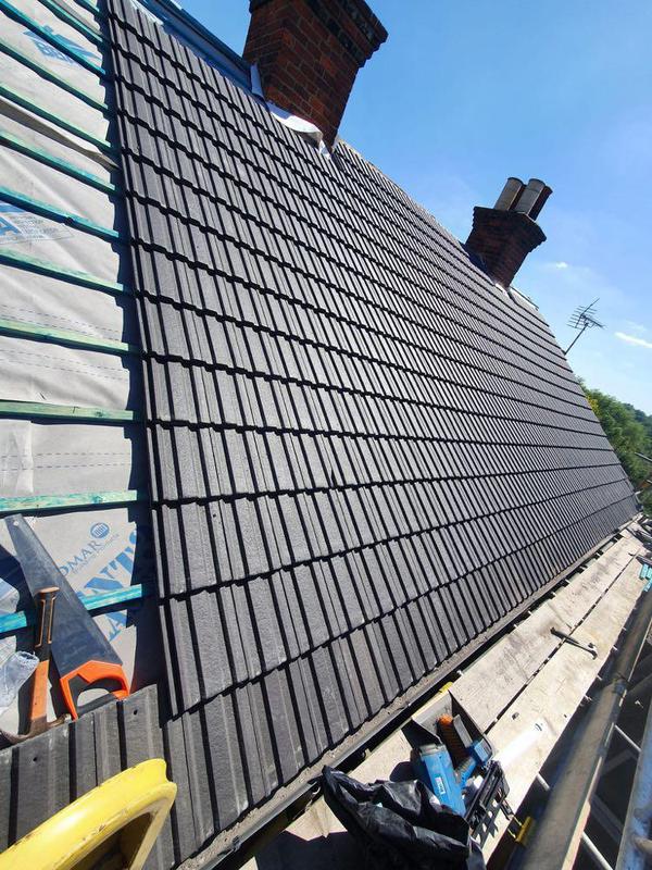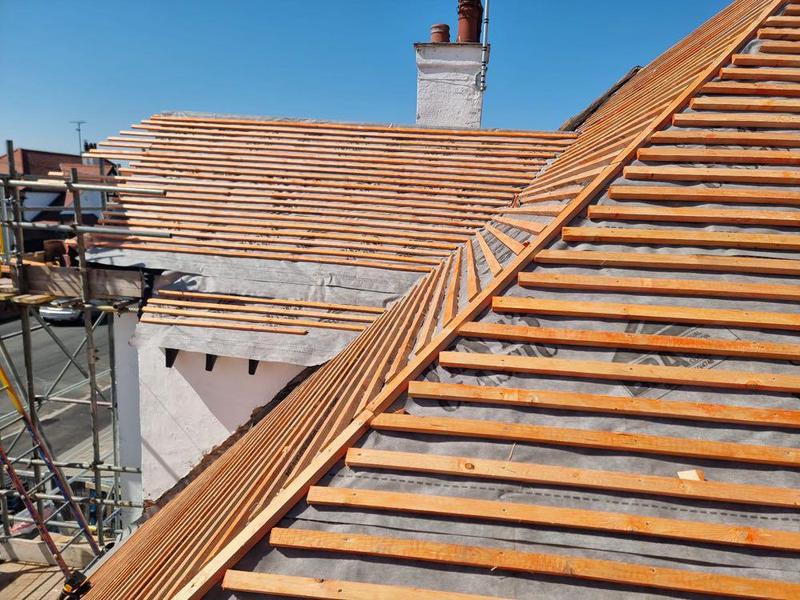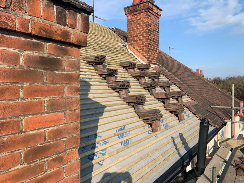 - tiled roof underway, using reclaimed tiles for a traditional look