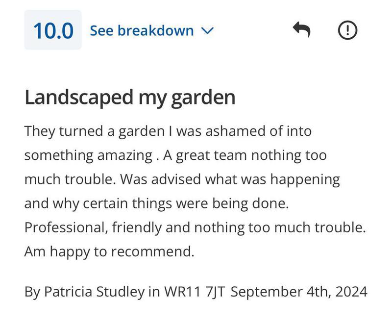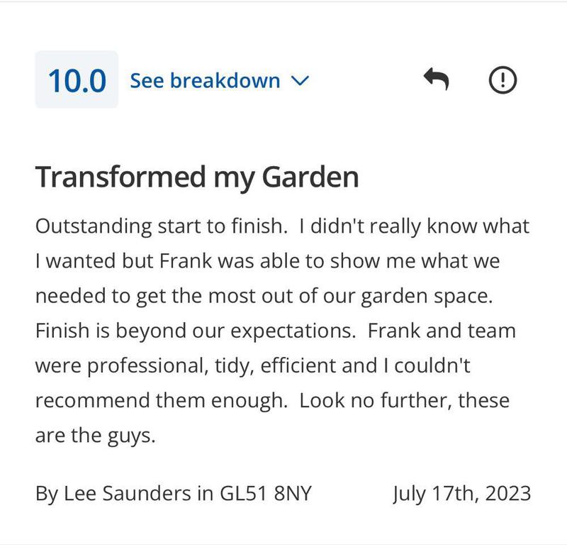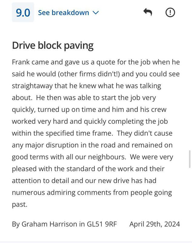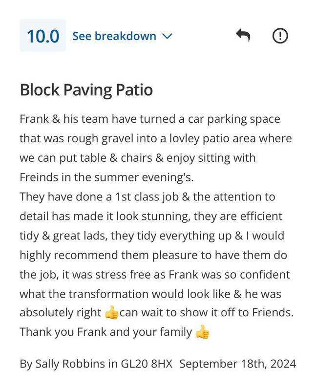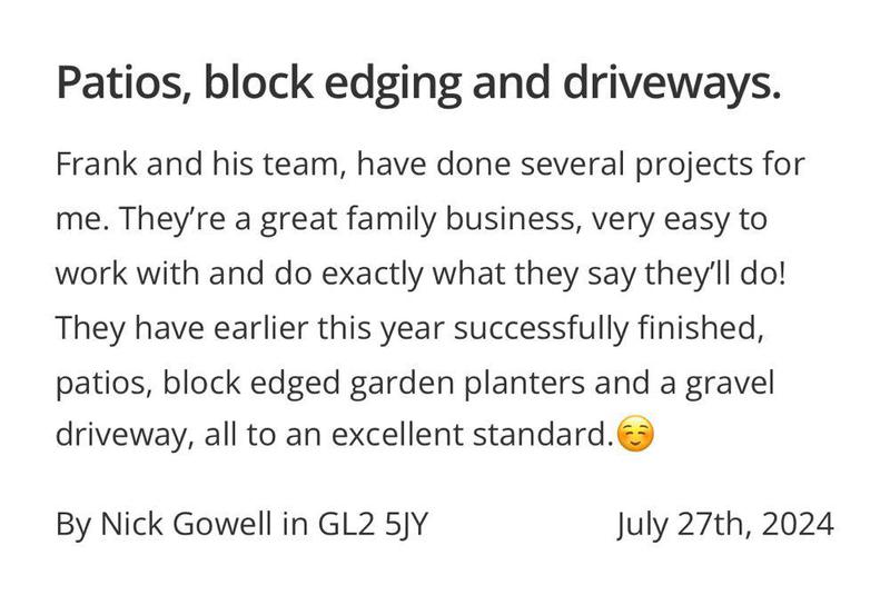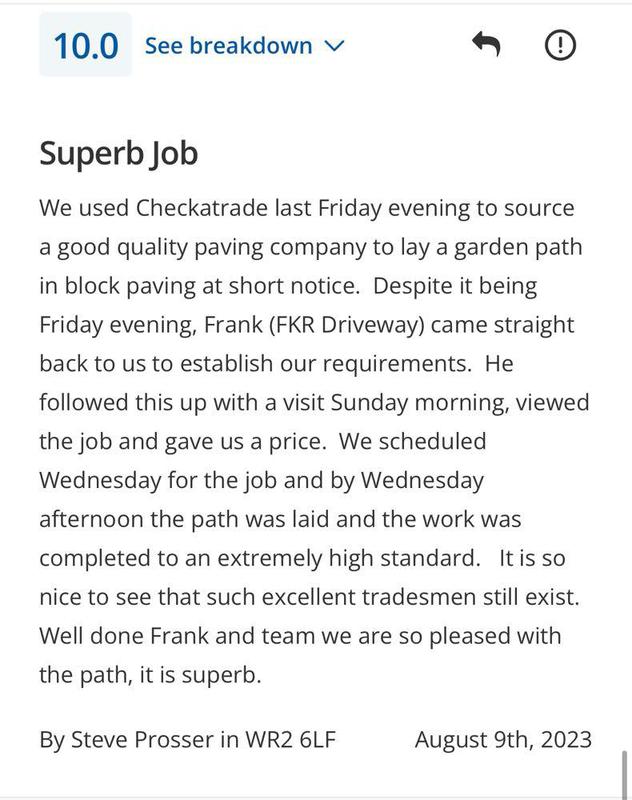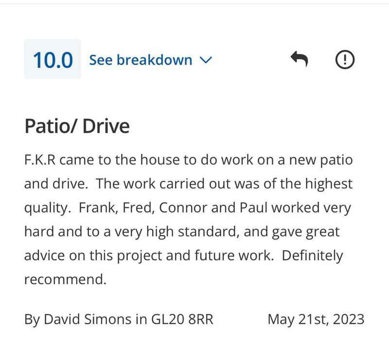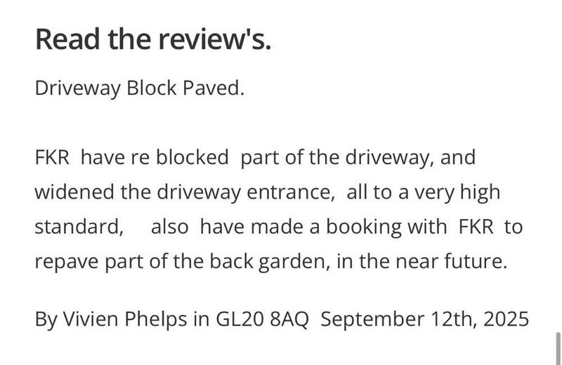 "FRK are a outstanding family run company, I have used FRK my drive way and my back garden and I am so over the moon with the work carried out and I have recommend them to family and friends."