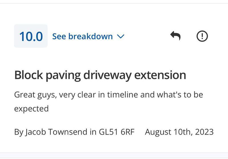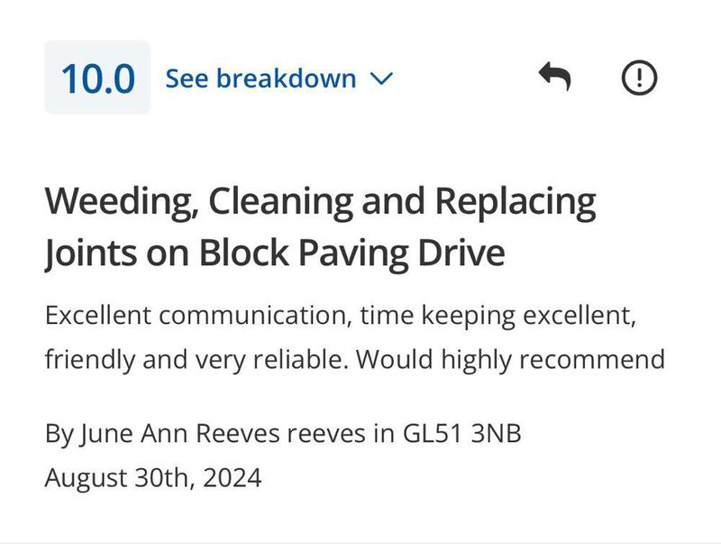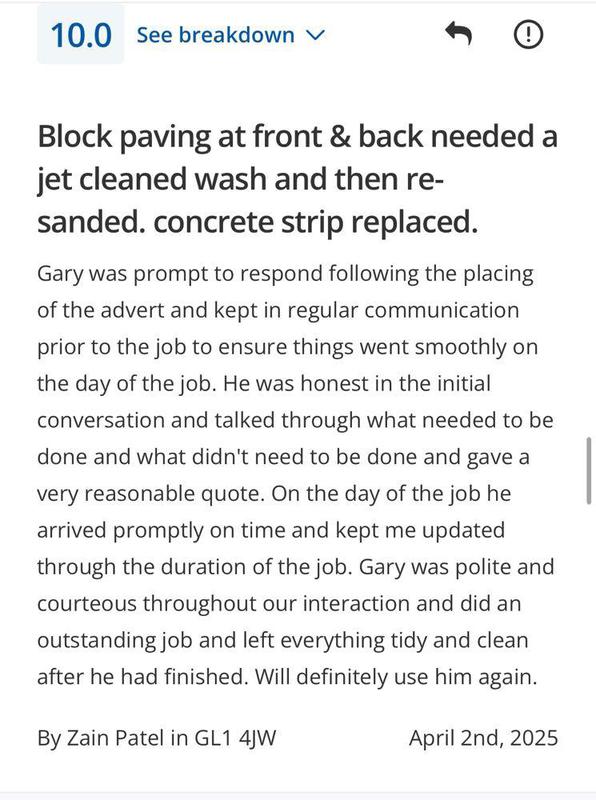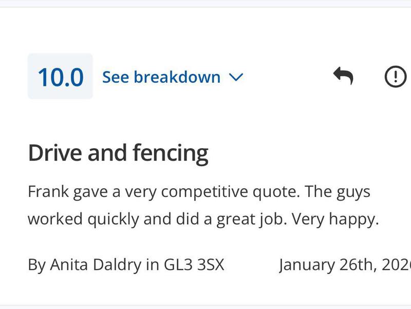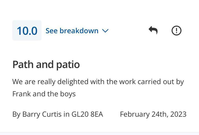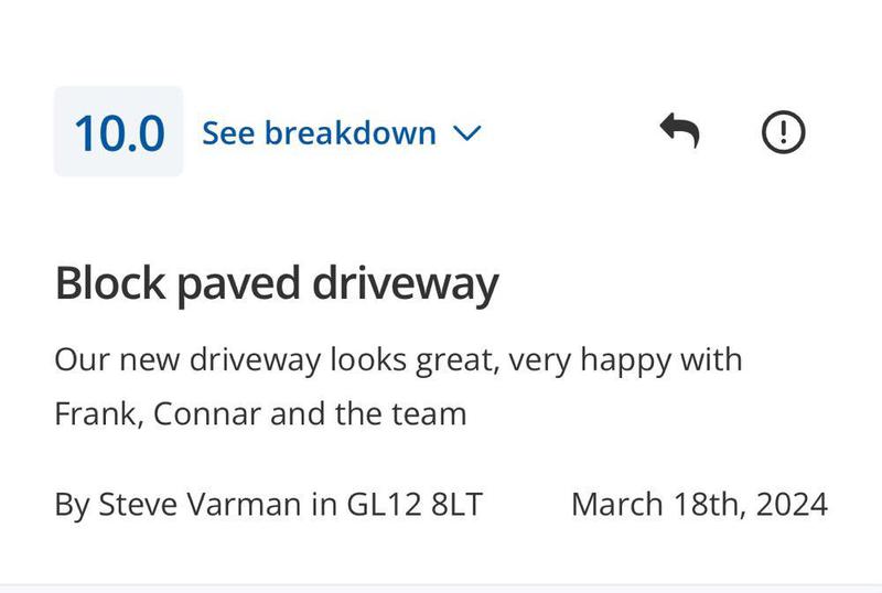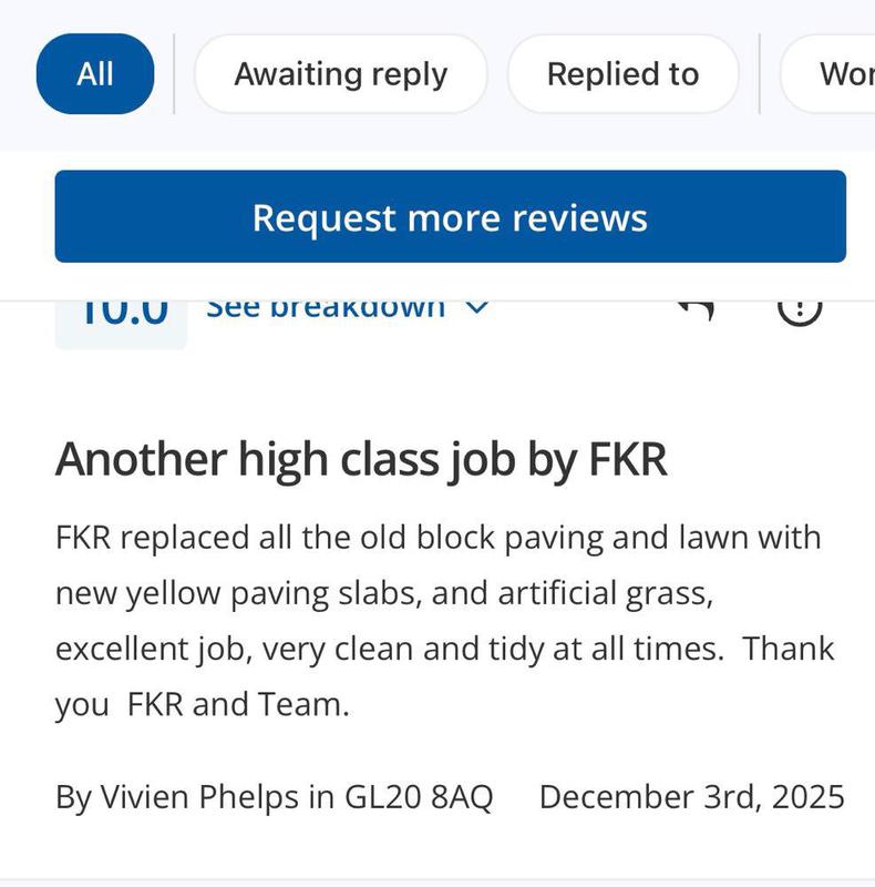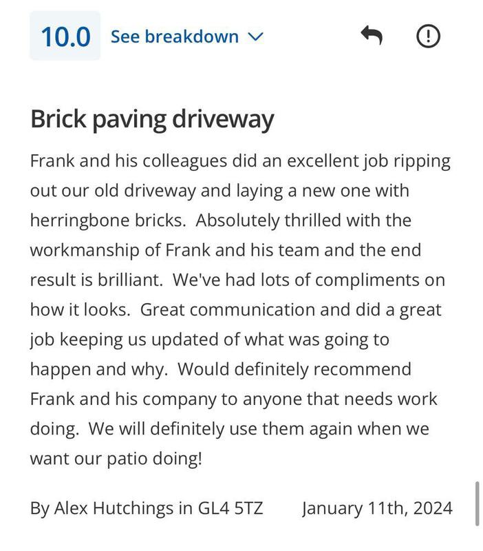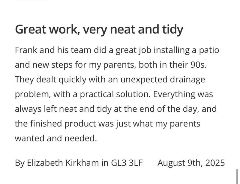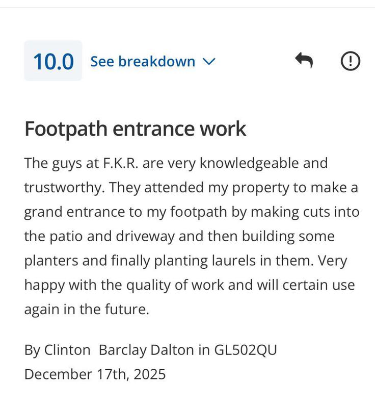 Alec Lloyd - Image 1 "We have used Frank and his team previously for some garden works at a family members property, so reached out to them to have our front driveway re-done. As always, FKR kept us updated on start dates, arrived on time and finished within the estimated completion period. FKR were a pleasure to have working on our home, always polite, courteous and came with the great sense of humour we’d experienced from them previously. A team that can truly be trusted and will get the job done really well. Their work has really positively changed the appearance of the front of our house, which is now up for sale. Couldn’t recommend them highly enough and I’m sure others would be satisfied with the quality of FKR’s work!"