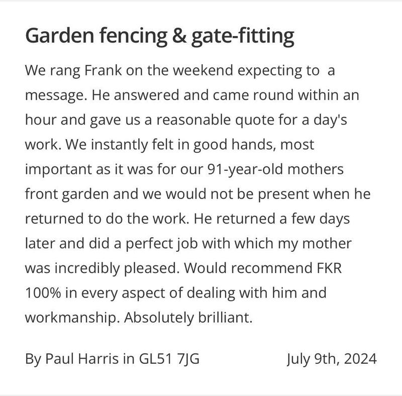 "I have used FRK for many years for quite a few jobs, they are my go too - I can not rate them enough, they are polite, helpful, hardworking and always on budget."