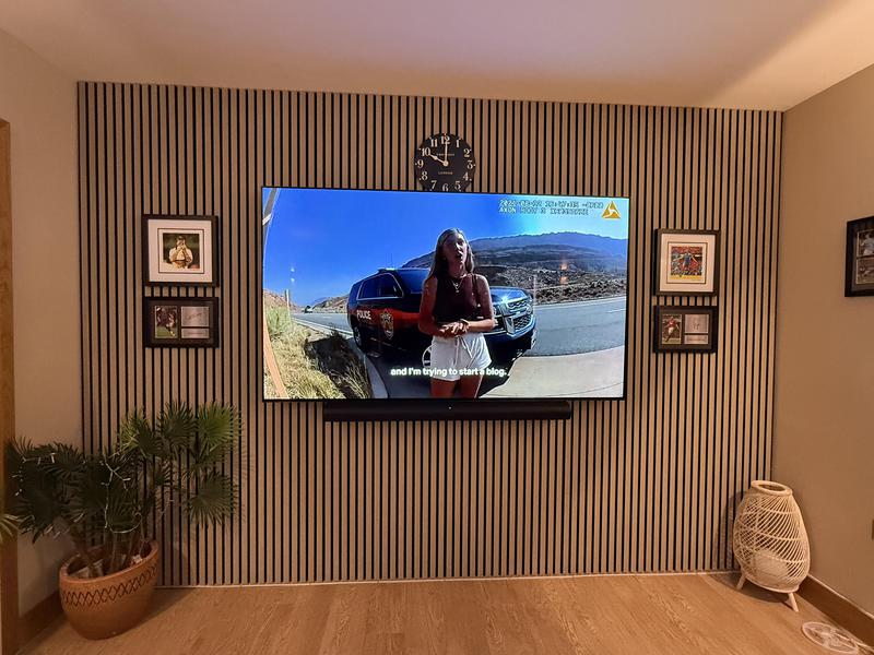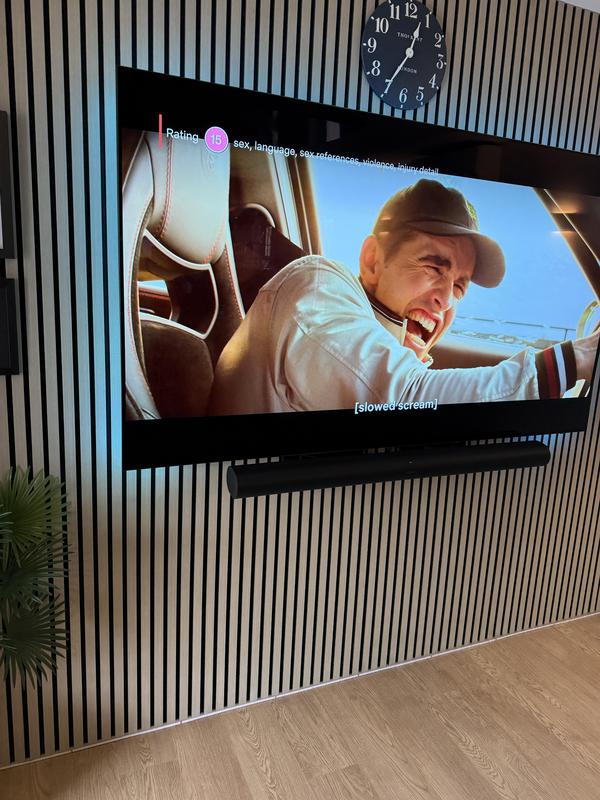 - Man cave cinema room with TV mounted on a media wall and Sonos ARC dolby Atmos soundbar mounted below the TV