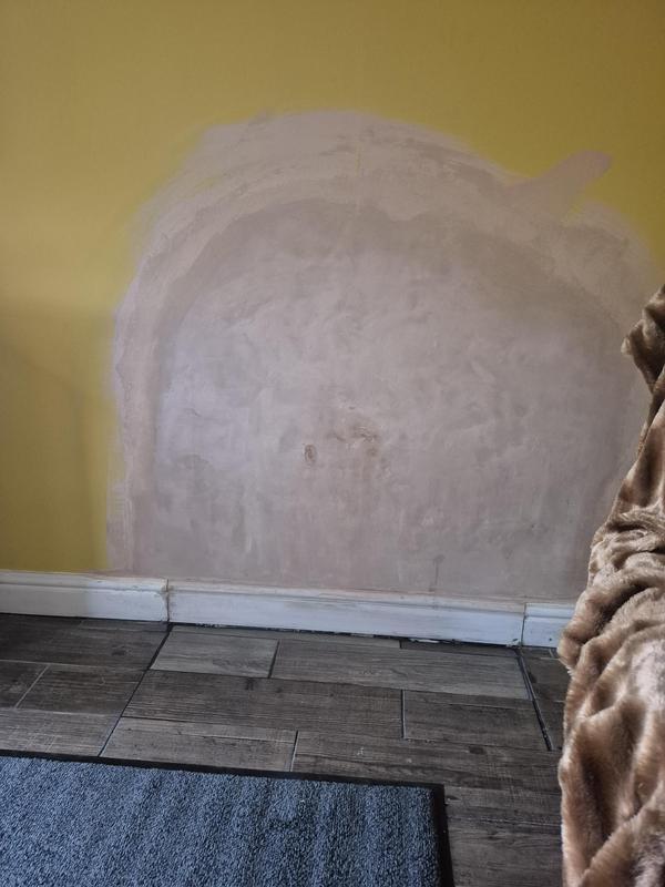 Angie - Image 1 "Work completed was removal of a free standing log burner and associated equipment. It included removing the hearth and flue, repairing the hole inside and bricking up the outside, replacing skirting board and floor tiles with best match. All plastered to a good finish ready for painting. Very neat job on the outside as can hardly tell where the hole was. Really pleased with the overall job"