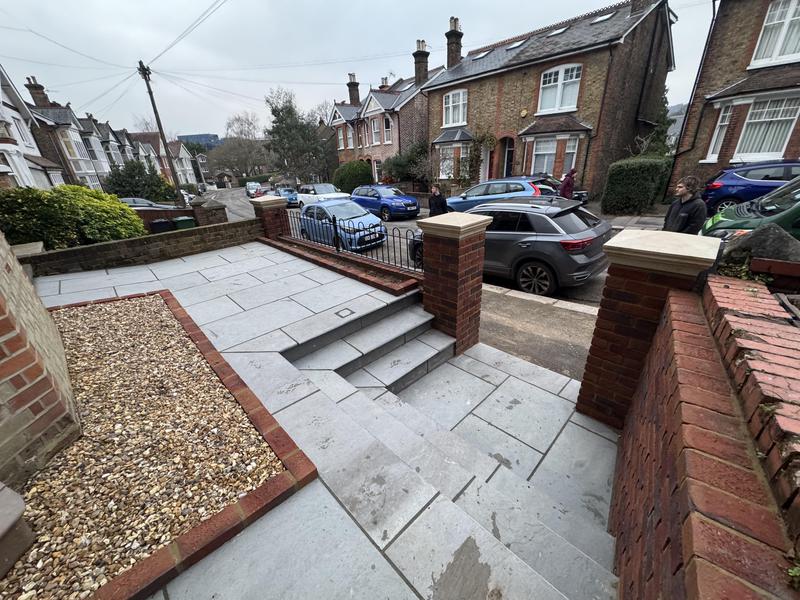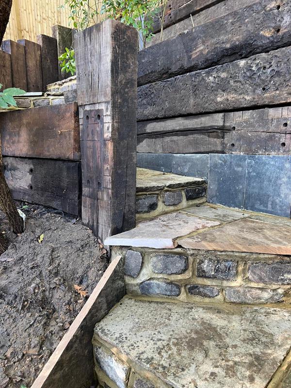 - Sean and Petra Reigate extensive clifftop retains walls and patio in reclaimed sandstone Birdbeak pointing step system