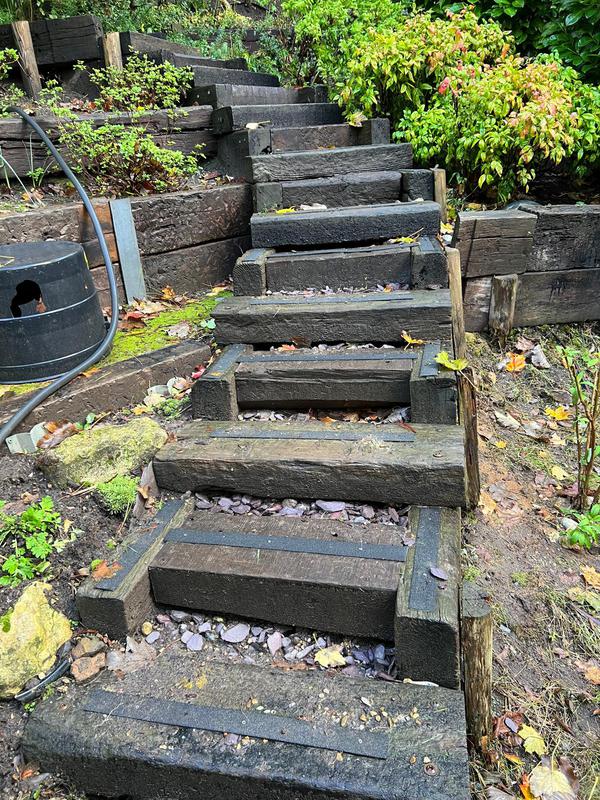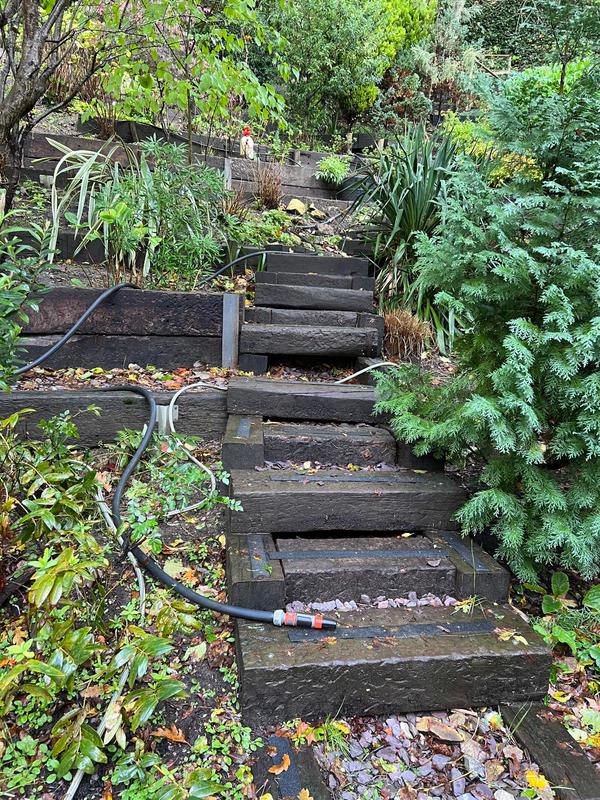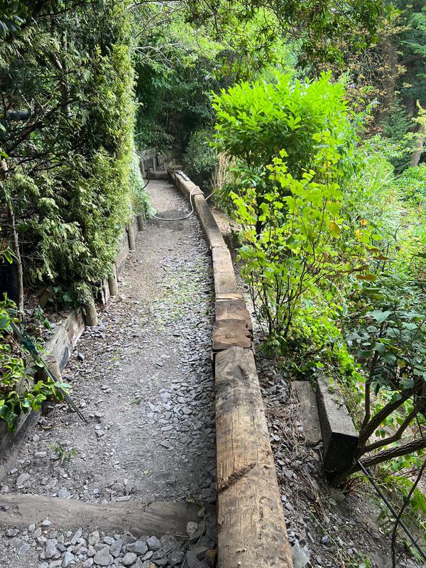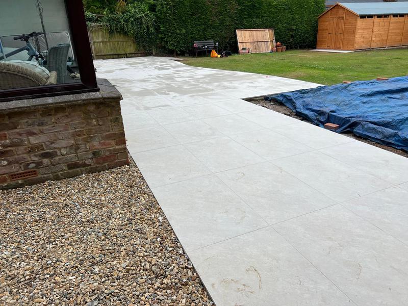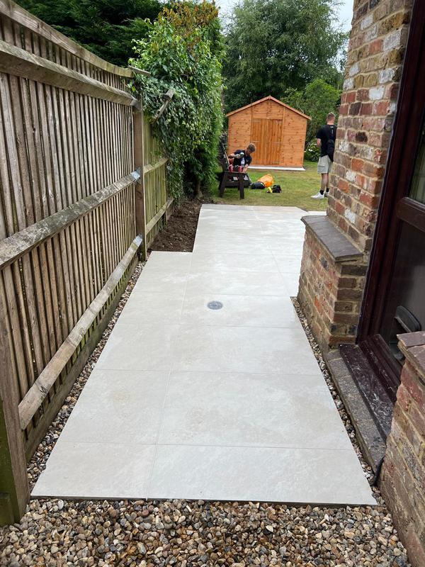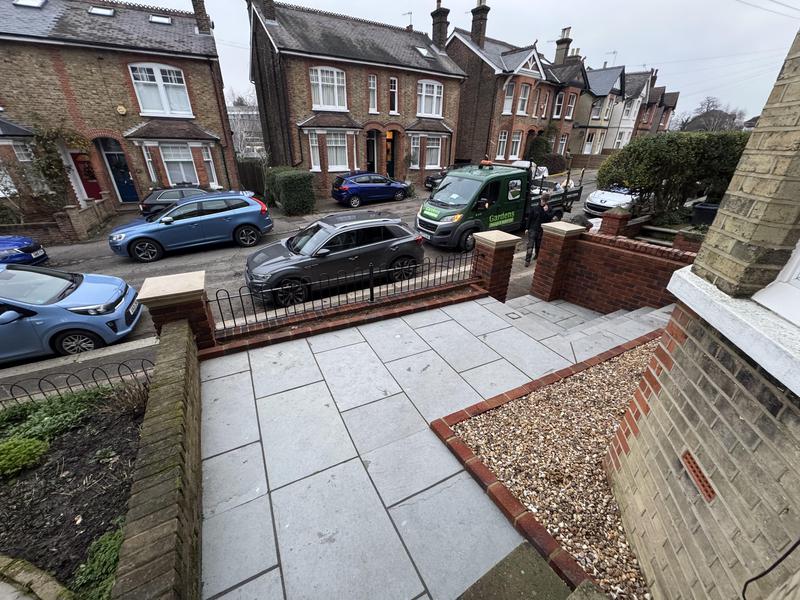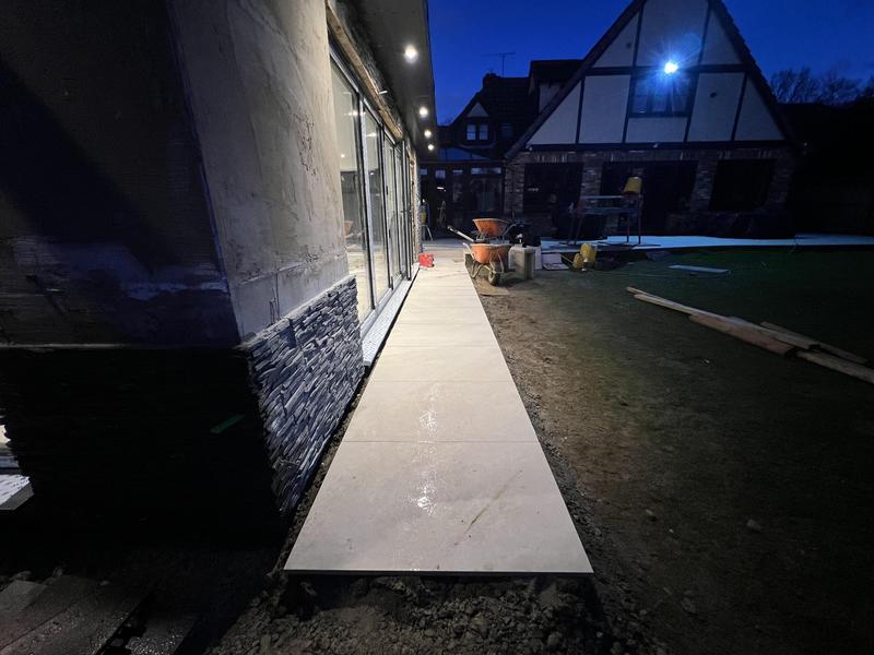 - Tom Sibley Redhill Limestone paving step system rendered walls returned graded garden oak planters shed base soil pipe connections gulley AFTER