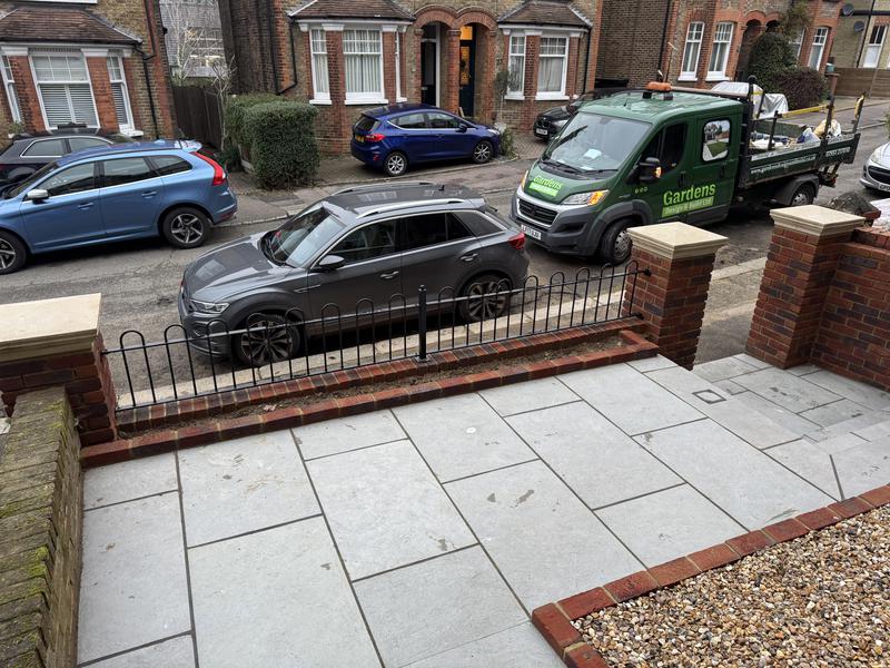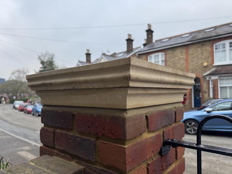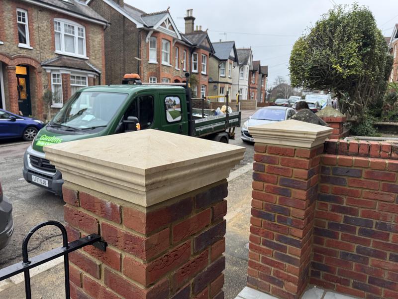 - CropDownloadDeleteRedhill front wall limestone Red brick crease tiles pier caps bullnose step system brick edging pushing grout bespoke railings brick on edge finish