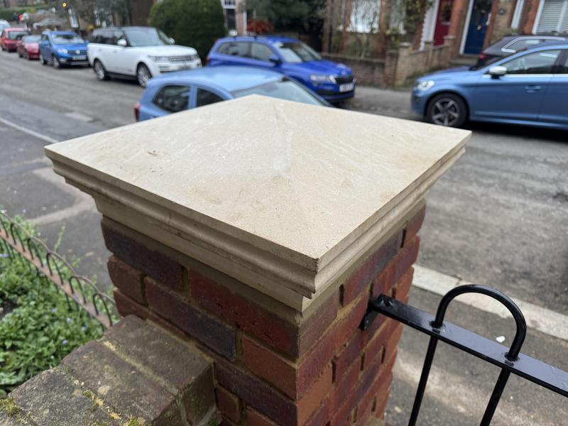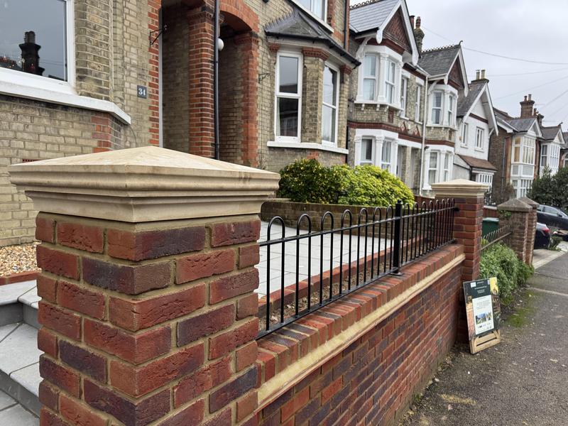 - Redhill fronRedhill front wall limestone Red brick crease tiles pier caps bullnose step system brick edging pushing grout bespoke railings brick on edge finisht wall limestone
