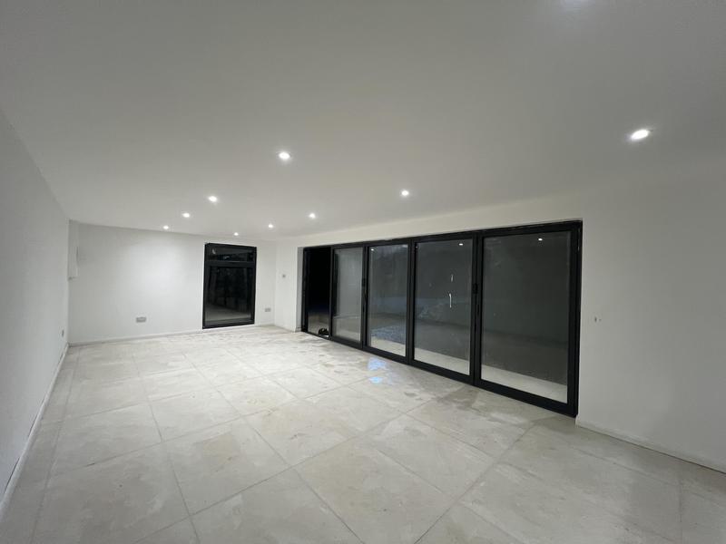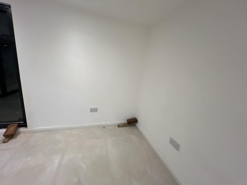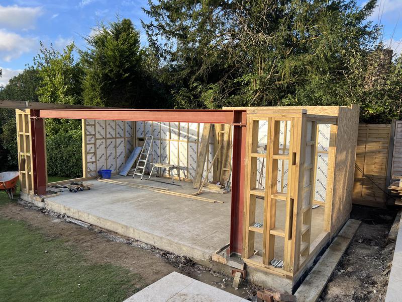 - Martin Pease Pottage Garden pod 30m2 Z clad slate tile cladding EPDM rubber roof 6m bifold doors porcelain interior Consumer unit electrical wiring installation canopy with outdoor downlighting gyms room plastered and painted finish fully insulated composite cladding floor to ceiling windows BEFORE