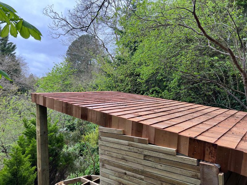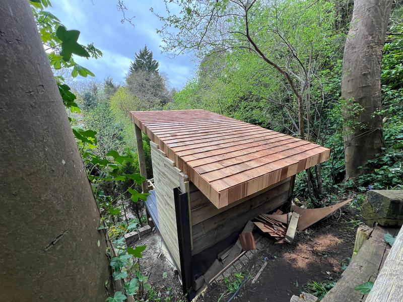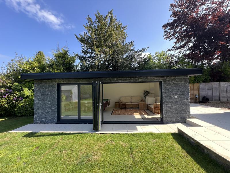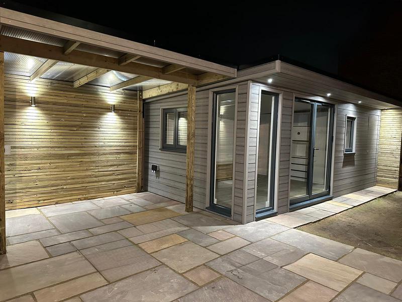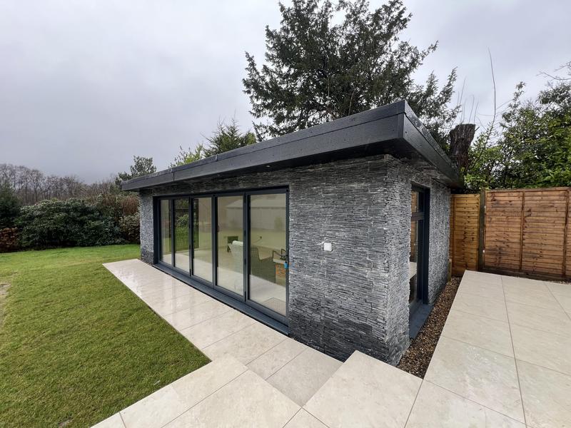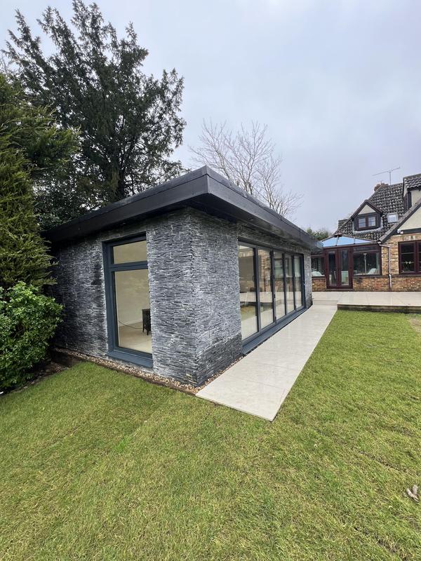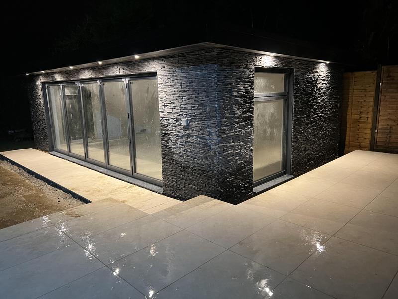 - Martin Pease Pottage Garden pod Garden shed and base which is part of the 30m2 Z clad slate tile cladding EPDM rubber roof 6m bifold doors porcelain interior Consumer unit electrical wiring installation canopy with outdoor downlighting gyms room plastered and painted finish fully insulated composite cladding floor to ceiling windows AFTER