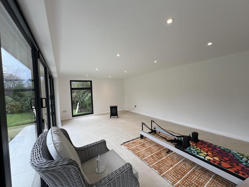 - Martin Pease Pottage Garden pod 30m2 Z clad slate tile cladding EPDM rubber roof 6m bifold doors porcelain interior Consumer unit electrical wiring installation canopy with outdoor downlighting gyms room plastered and painted finish fully insulated composite cladding floor to ceiling windows AFTER
