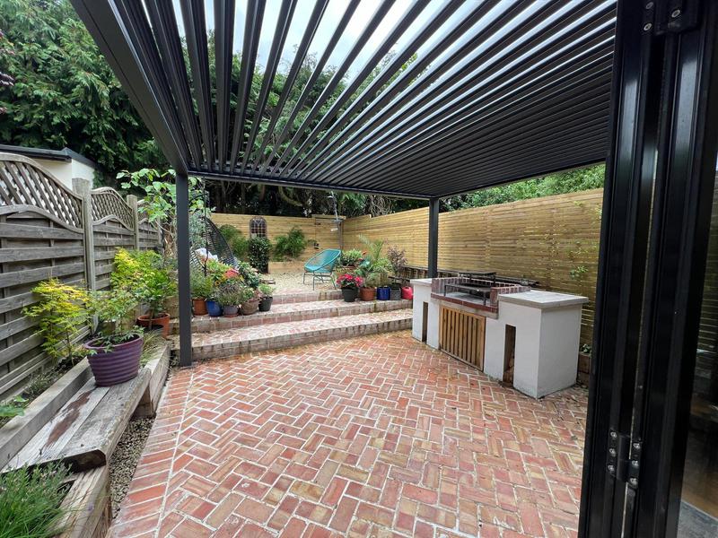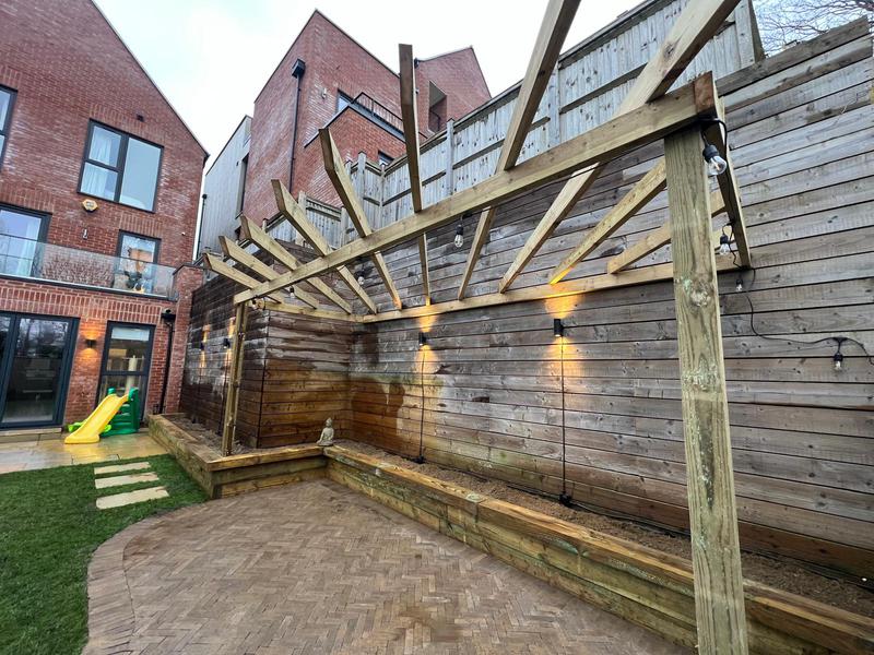 - Lorna and Matt Earlswood full garden renovation AFTER limestone pergola lights slimset paving edging planters bench system