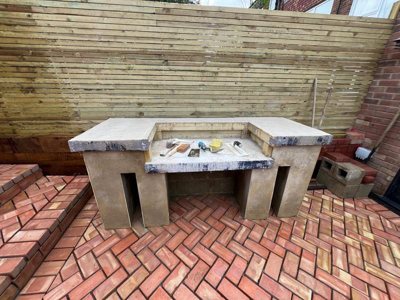 - kuda salfords garden pod sandstone patio shelter astro turf oak planter Bespoke BBQ