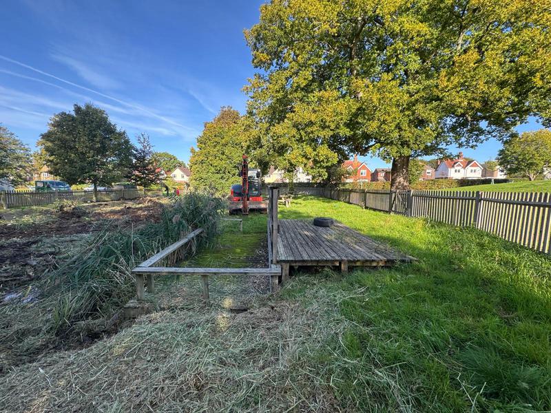 - Junior School Earlswood Very large pond redevelopment cantilevered decking composite BEFORE