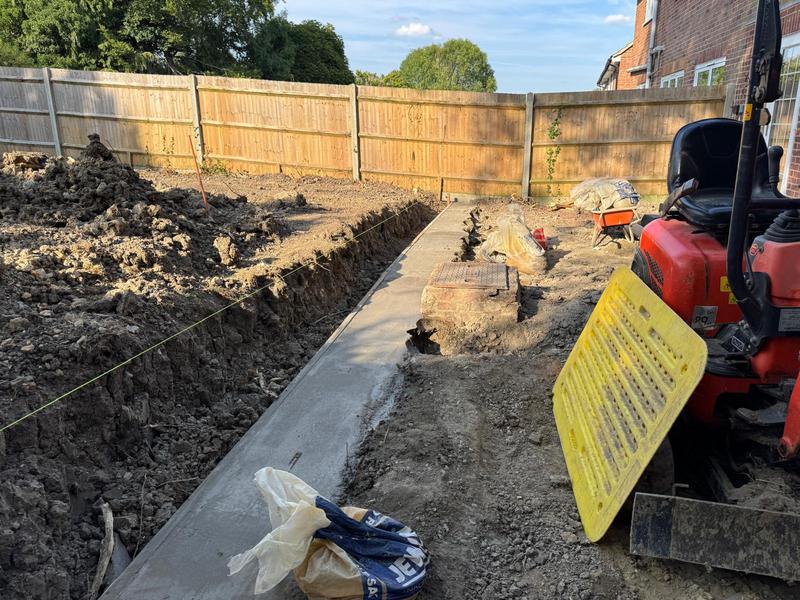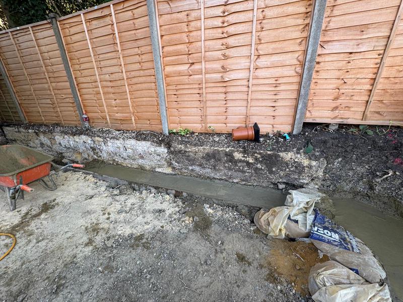 - Tom Sibley Redhill Limestone paving step system rendered walls returned graded garden oak planters shed base soil pipe connections gulley BEFORE