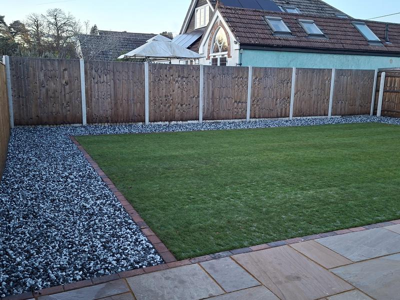 - Patio with a one brick course retaining wall to stop flooding in heavy rain, finished off with Grey Indian sandstone.