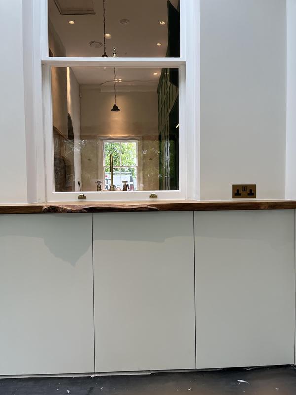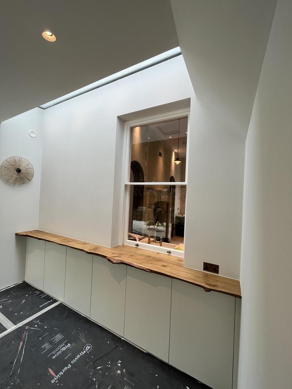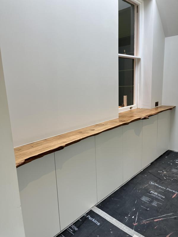 - Live Edge Oak Serving hatch with Custom Cabinetry