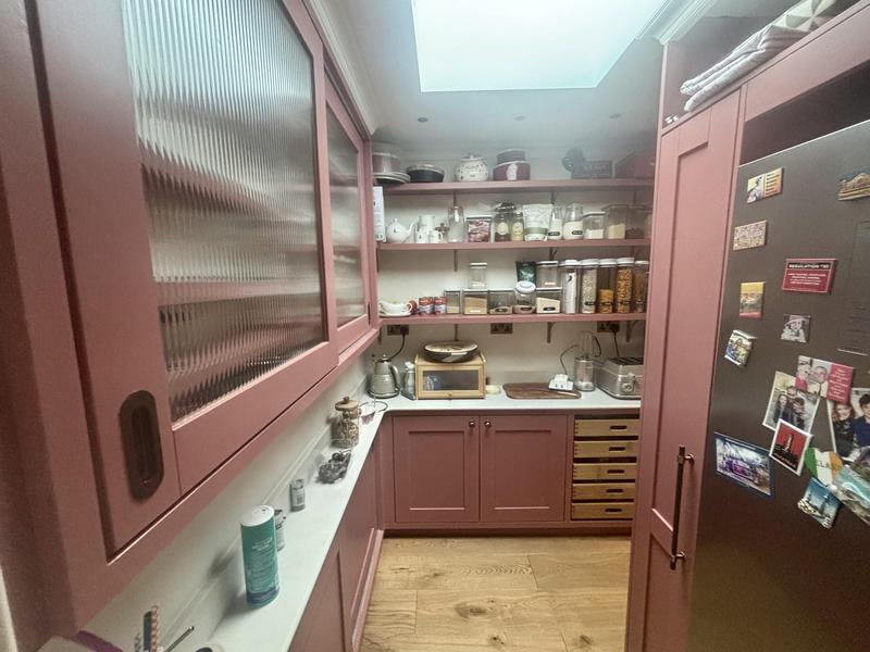 - Built in pantry cupboards with marble worktop, open shelving and floor to ceiling wine rack.
