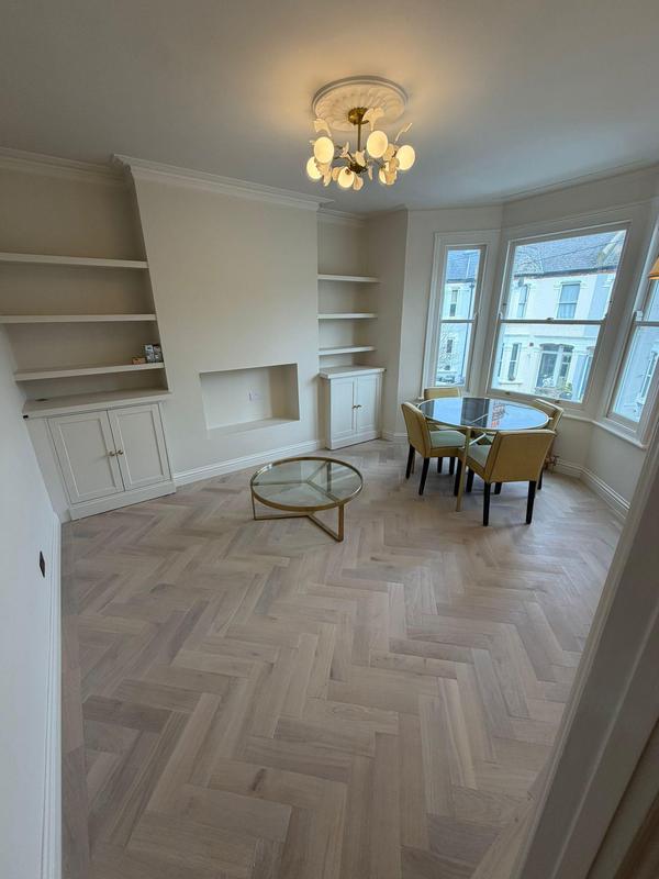 Liz - Image 1 "HD Construction Full refurbishment project completed including the bathroom, living room, and hallway. The project included installing new herringbone wood flooring in the living room, modern flooring in the hallway and stairs, bespoke shelving and cabinetry, and a full bathroom renovation with new tiles, bath, vanity unit, and fittings. The manager was great to work with — always on time, professional, and ensured the site was kept clean and organised throughout the project. Great attention was given to detail and finish to create a clean, modern, and elegant look throughout the property. Another successful project completed with a very happy client."