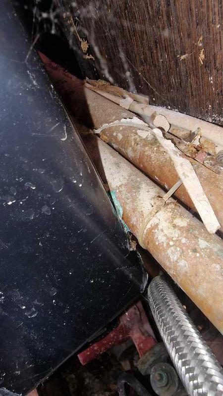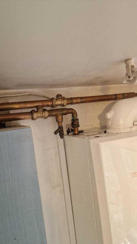 - another cowboy special, the primary heating pipework from the boiler resting on the back of the cloakroom toilet cistern and as you can see over time it has melted a small hole in it that small hole has leaked and corroded the pipe and has also dropped down on to the heating pump irreversibly damaging it