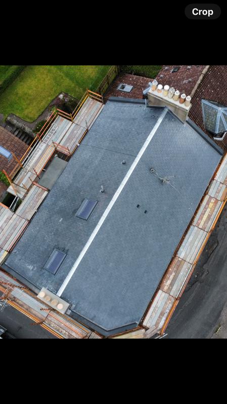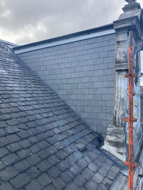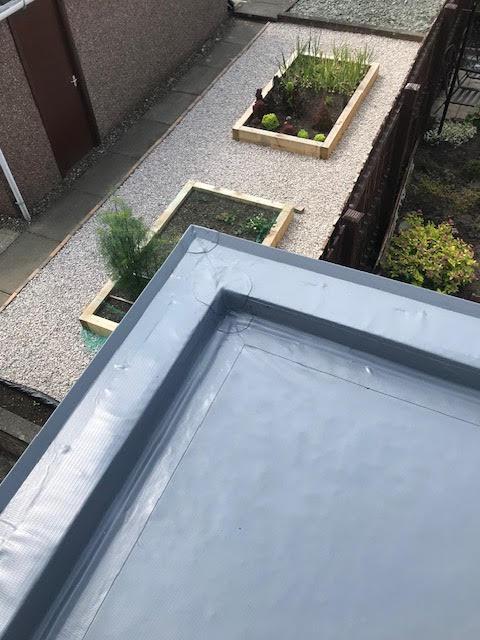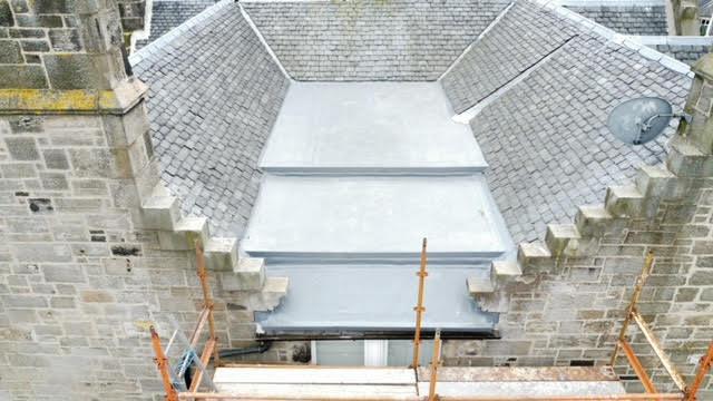 - Fatra single ply flat roof with UPVC fascia and gutter. Spanish slate on the vertical panel
