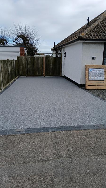 Vanessa A - Image 1 "Stuart and the team did a great job at taking down an old front garden half wall and creating a new ground base to install a resin patio for better ease of storing wheelie bins and a bike storage solution. Very happy with the end result and would highly recommend them to anyone."