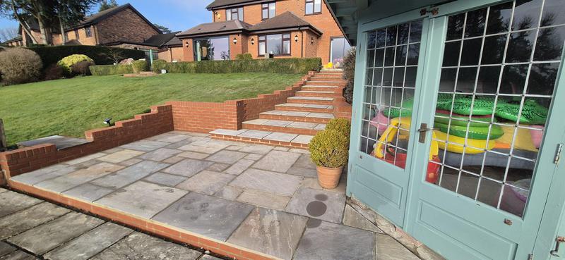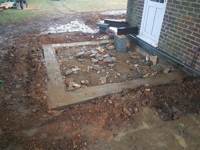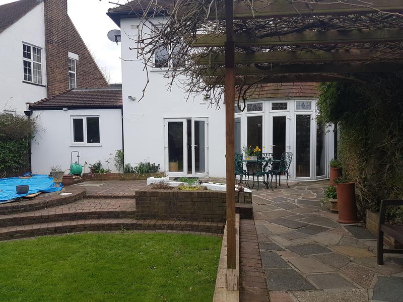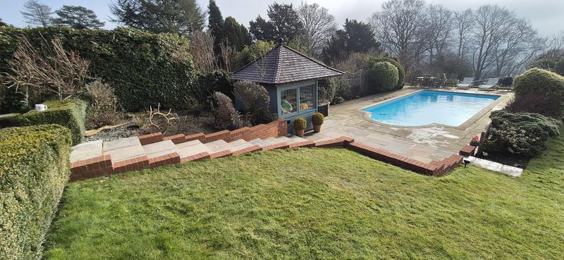 Warlingham. Single Storey rear Extension with with new steps to pool with paving.
