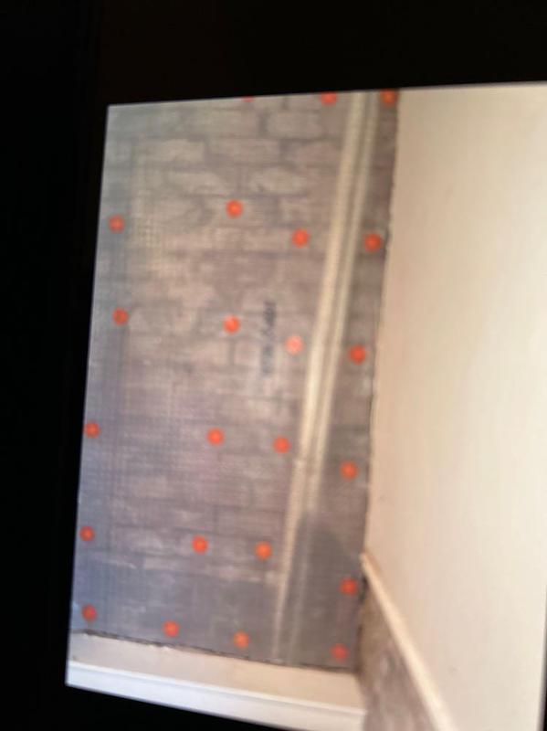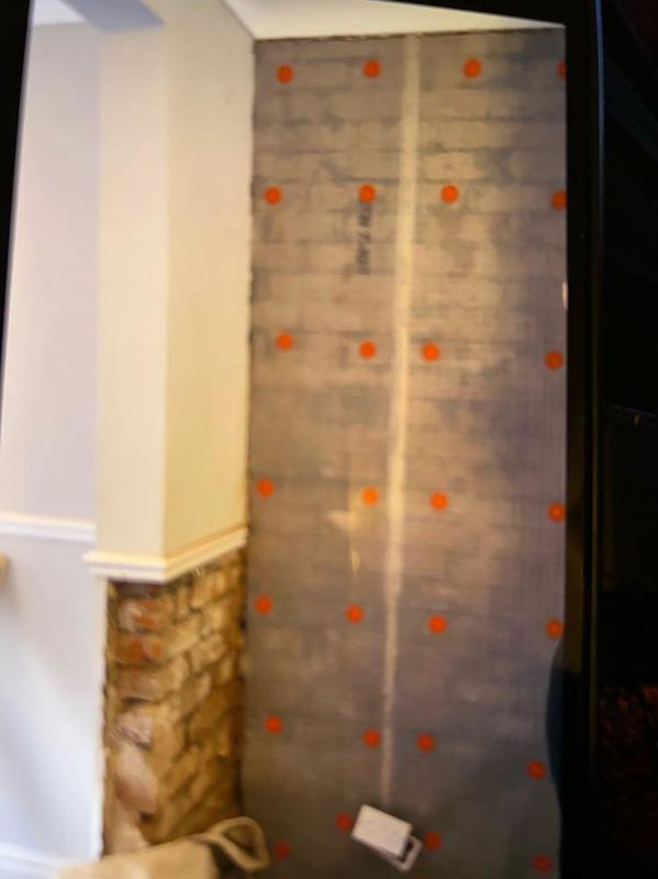 - After membrane, green waterproof boarding goes on before finishing plaster is applied making the walls completely dry