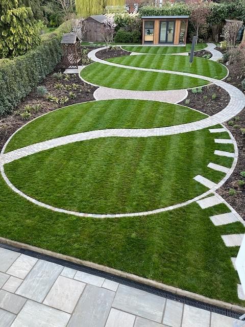 John - Image 1 "The scope of this work included the removal of existing hedges, conifers, shrubs and lawn. The installation of new stonework utilising 100mm sandstone setts and slabs and resin bonding as per the design supplied by our designer to an exact specification. In addition was the requirement to improve the soil and drainage, grade and lay the new lawn areas, and to completely rake out and repoint the existing patio area that wraps around the house. The work was started in January and Mark and his sons turned up early each morning without fail and worked relentlessly through the day. The project was completed to time and cost, in spite of some very wet and rainy days. I cannot fault the standard of workmanship and the effort that M&S Garden Services put into getting the stonework perfect and in meeting the full design requirements. Communication was excellent and they were happy to accommodate additional works as required. I would happily recommend M&S Garden Services to friends and family."