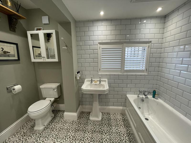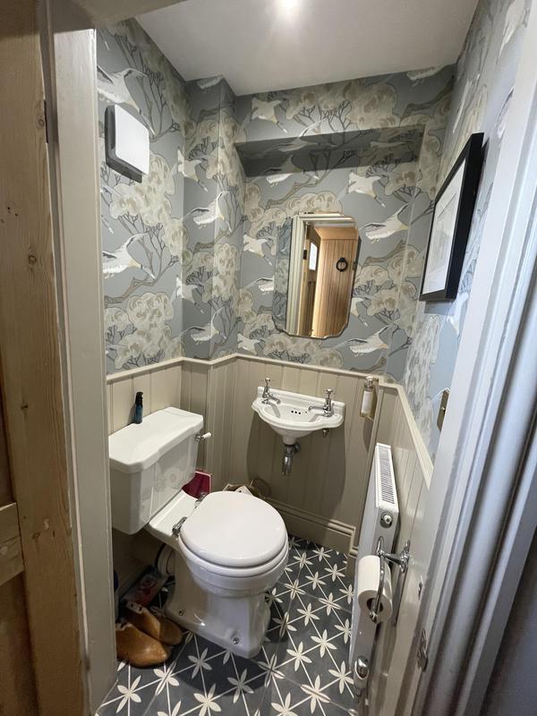 - Antique paint effect on bathroom unit with classical style wallpaper