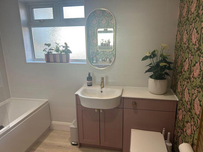 - New bathroom fit with pink tiles and black fittings. Westcliff on sea.